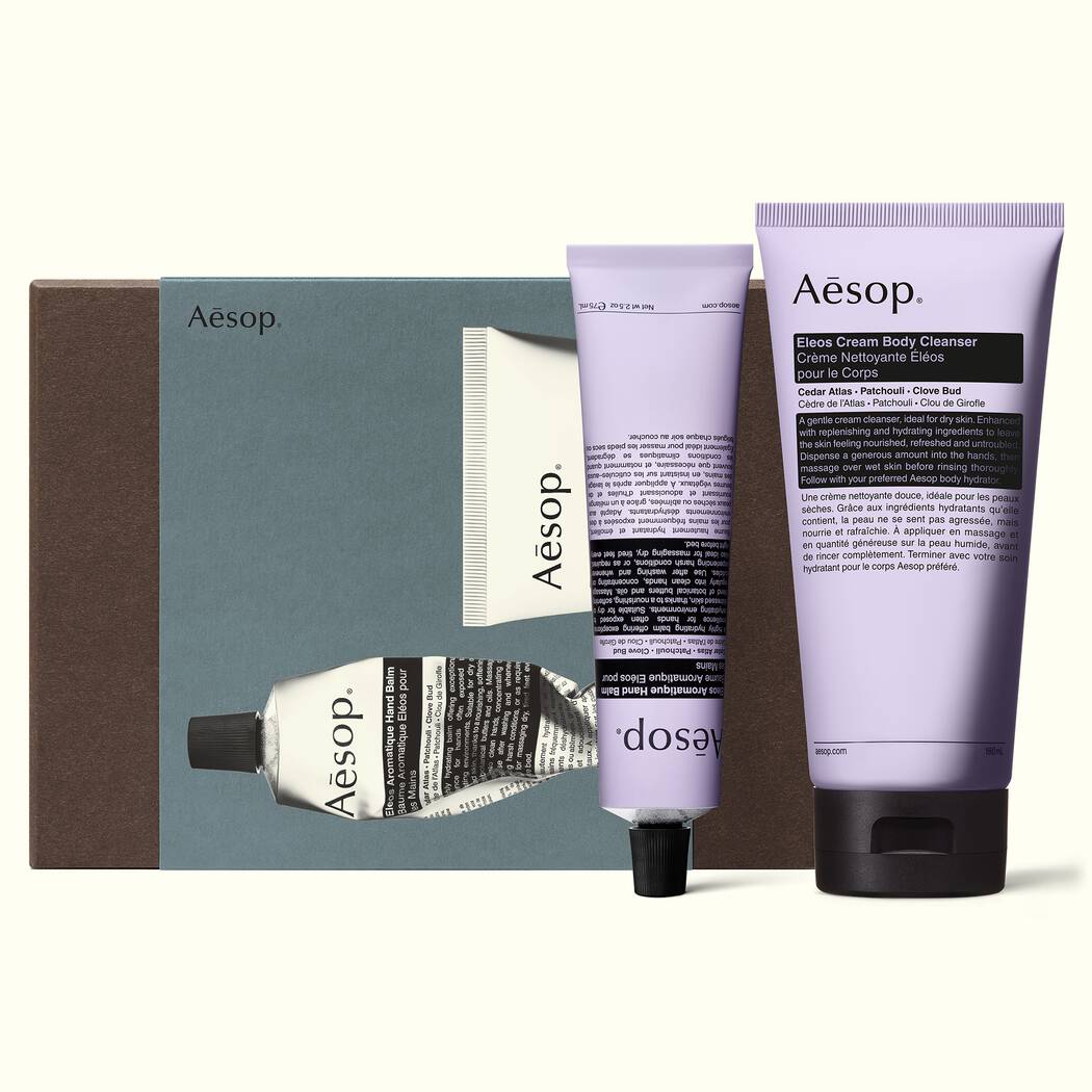 Aesop(イソップ)の「シャワールームセレナーデ」は、ウッディ・スパイシー・ハーバルの香りを共有する、エレオス クリーム ボディクレンザーとエレオス アロマティック ハンドバームのギフトセットです。