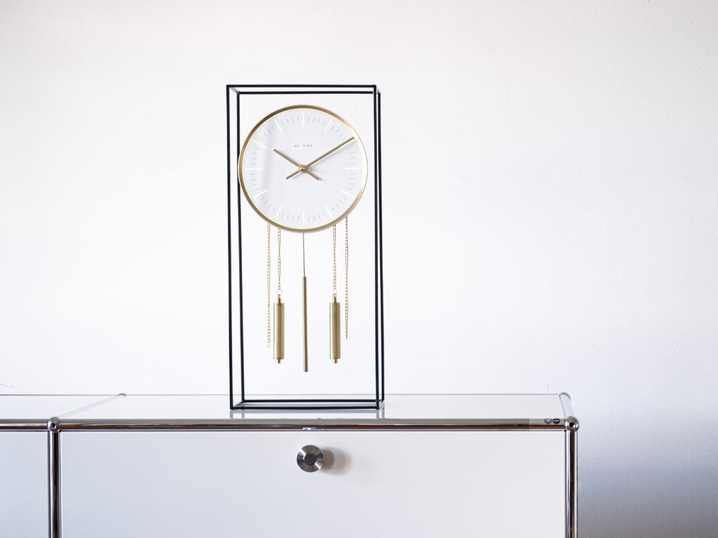 静音性に優れた振り子式で、モダンな空間に上質なアクセントを添えます。ブラックフレームとゴールドディテールの洗練されたデザインは、どのような空間にも自然に溶け込むため、自宅はもちろん、オフィスにも置きやすい逸品。