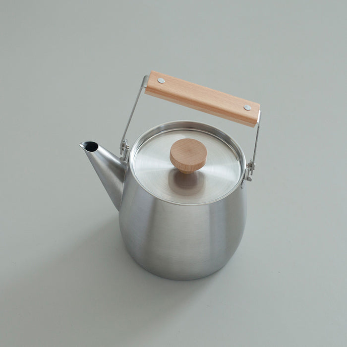 ホーローならではの清潔感ある質感に、木製のハンドルとつまみが温もりを添えます。1.45Lの程よいサイズ感で、毎日のお茶やコーヒーに活躍します。