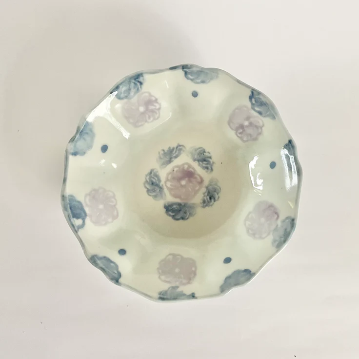 神楽坂 佑楽「紫菊印判4寸鉢」は、はんなりとしたパープルの花模様がかわいい小鉢です。