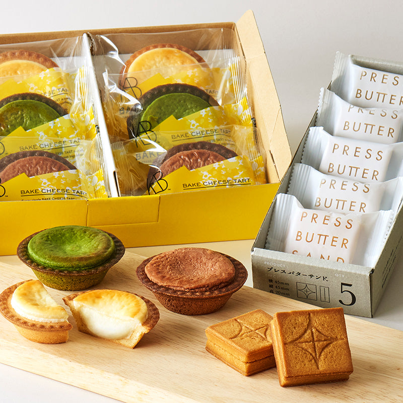 BAKE INC.の「BAKE トライアルセット」は、ブランドを代表する商品である、PRESS BUTTER SANDのバターサンドと、BAKE CHEESE TARTのチーズタルトの詰め合わせです。