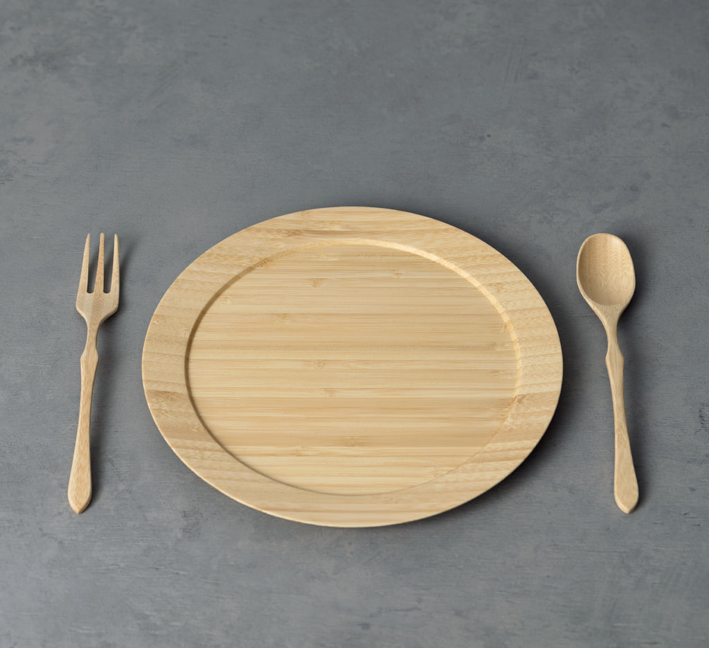 直径24cmのディナープレートにフォークとスプーンが付いた天然竹製ギフトセットです。