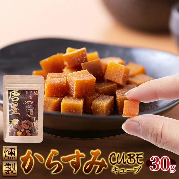 ひなた舎が手掛ける「燻製からすみCUBE」は、宮崎県日向灘沖で獲れた沖ボラの卵巣から作った高級珍味のからすみを一口サイズのキューブ状にカットし、桜チップで燻製にした逸品