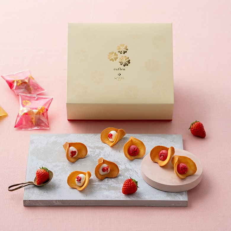 KINEEL(キニール)「ルフル16個入」は、お花の形のラングドシャになめらかなクリームを挟んだ華やかなスイーツ。花びらを思わせる繊細なフォルムが印象的で、箱を開けた瞬間に目を引きます。
