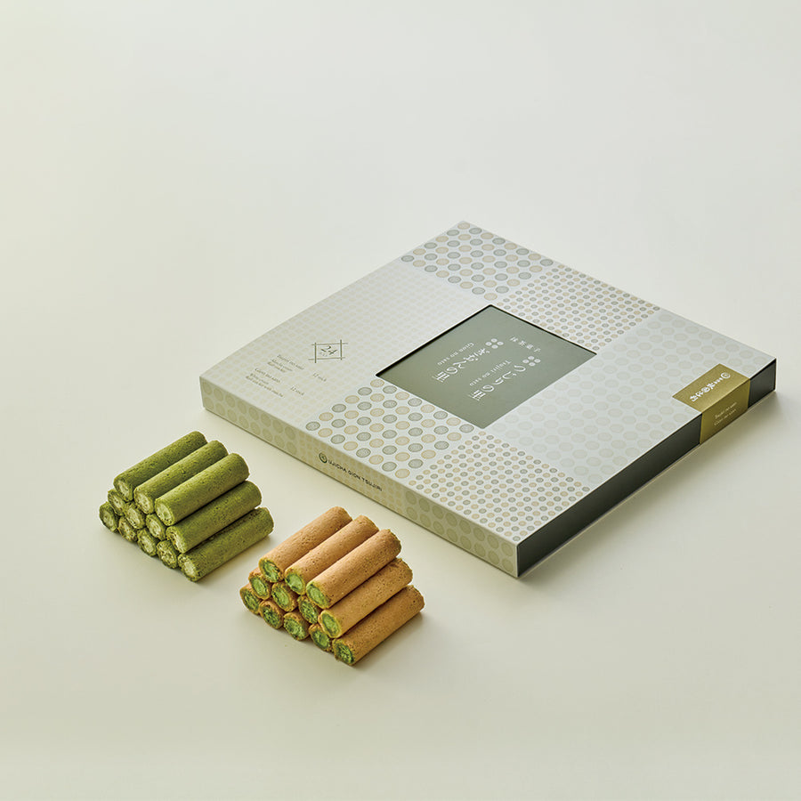 祇園辻利「つじりの里・ぎおんの里 24本(各12本)」は、抹茶が有名な祇園辻利の人気の抹茶菓子2種を詰め合わせたスイーツアソート。薄焼きロールせんべいで抹茶クリームを包み、軽い食感と風味を楽しめます