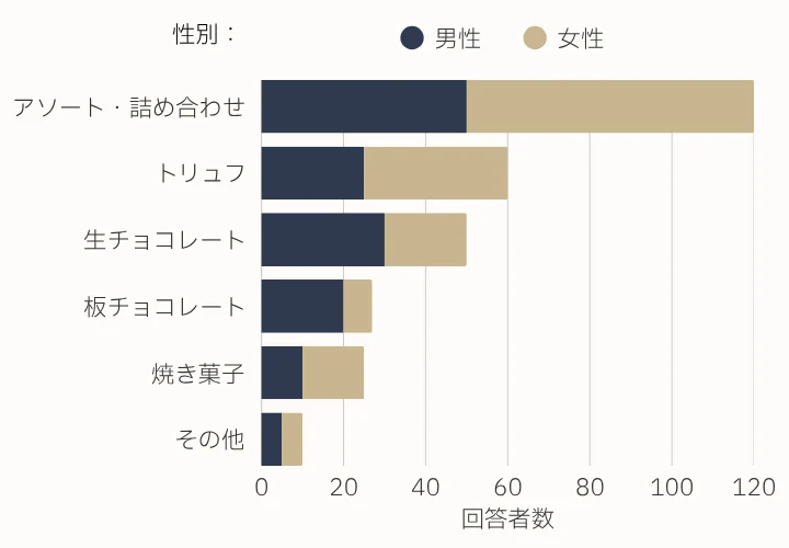 女性は見た目の美しさや一粒の特別感がある「トリュフ」を好み、男性は「生チョコ」のわかりやすいリッチさを支持する傾向があります。