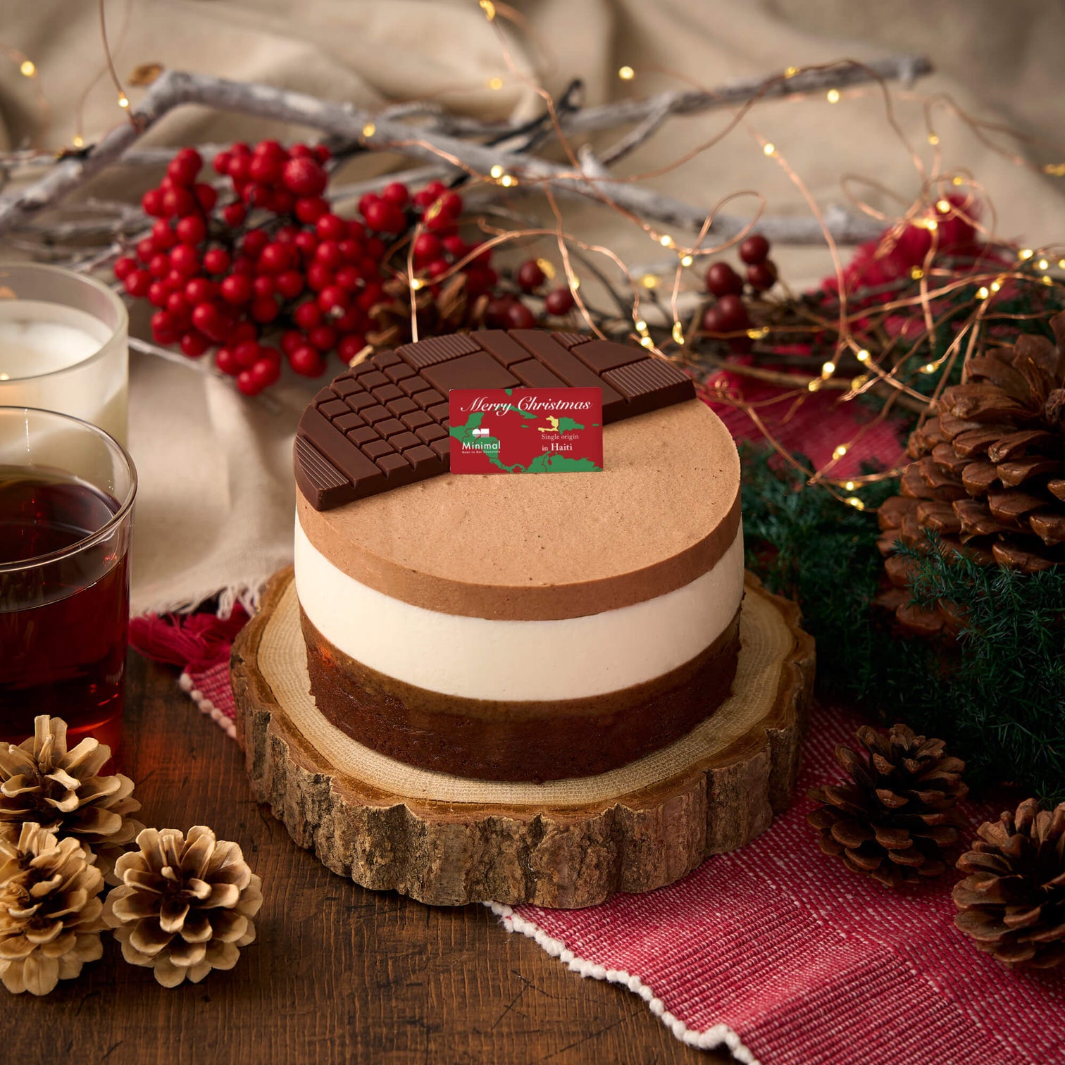 そんなMinimalが手がけるオリジナルのクリスマスケーキは、国際品評会で高評価を受けたカカオを使用した7層構造の贅沢なケーキ。華やかなカカオの香りと果実感が特徴で、中央に忍ばせたオレンジのジュレが味わいのアクセントを加えています。