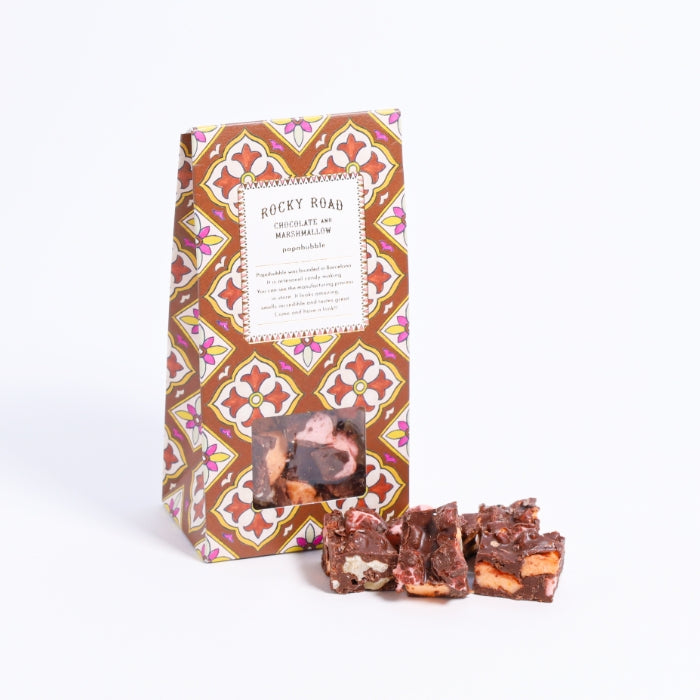スペイン発祥のアート・キャンディショップ、パパブブレが手掛ける「ミルクロッキーロード カット」は、ビター感のあるミルクチョコレートに、自家製マシュマロと2種のナッツを混ぜ込んだ個性派チョコレートです。