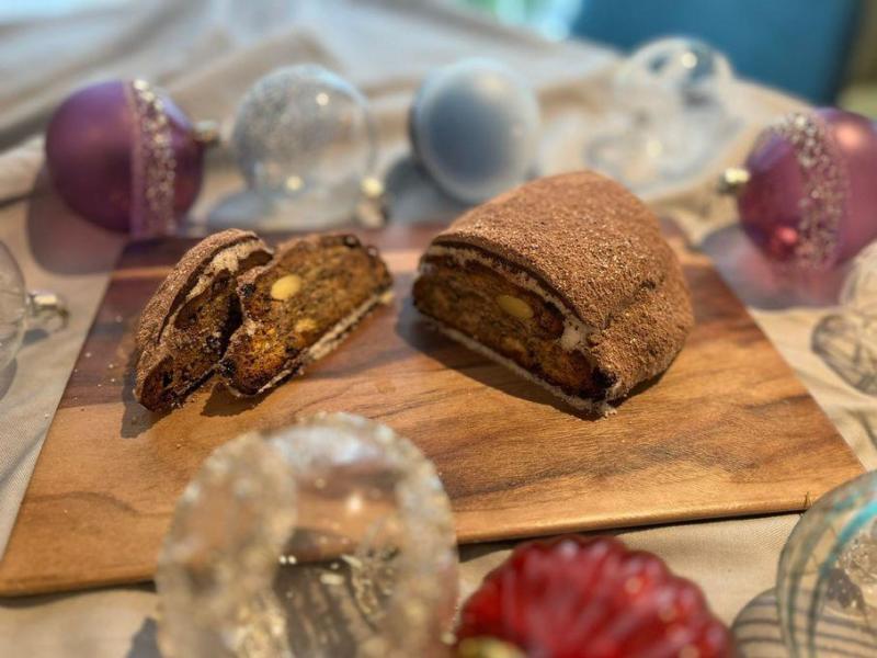 シュトーレンは、ドイツでクリスマスシーズンに食べられる伝統的なお菓子です。表面にはたっぷりの粉糖がまぶされ、まるで雪化粧をしたような姿が印象的。中にはドライフルーツやナッツがぎっしり詰まっており、時間とともに味わいが深まっていきます。