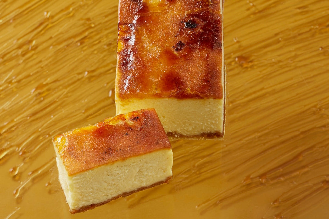 100%発酵バターを使ったベイクドチーズケーキの表面に、焦がしキャラメルが敷き詰められていて、香ばしい甘さと食感のアクセントを楽しめます。
